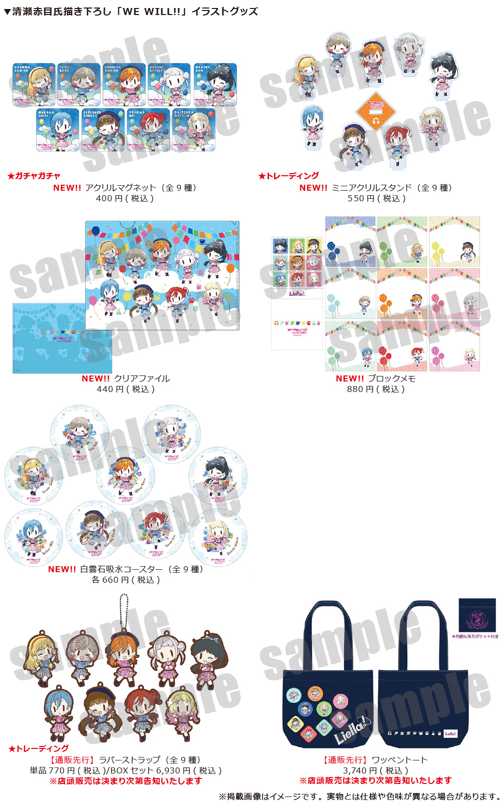 通販サイトでは、清瀬赤目氏描き下ろし「WE WILL!!」衣装イラスト商品、または「リエラのうた2」イラスト商品を含む商品金額合計3,300円(税込)のご注文ごとにブロマイドを1枚ランダムでお付けいたします。