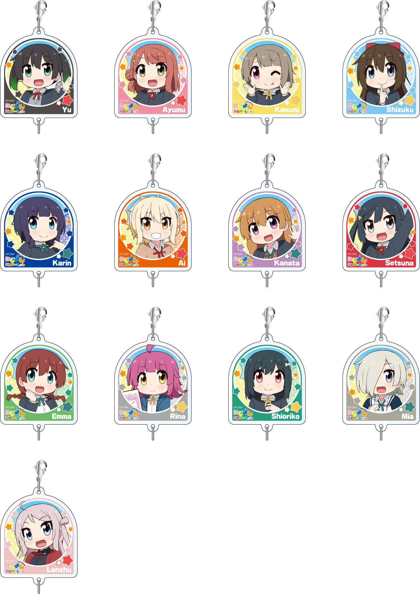 高咲 侑、上原 歩夢、中須 かすみ、桜坂 しずく、朝香 果林、宮下 愛、近江 彼方、優木 せつ菜、エマ・ヴェルデ、天王寺 璃奈、三船 栞子、ミア・テイラー、鐘 嵐珠をアクリルステッカーに仕上げました。