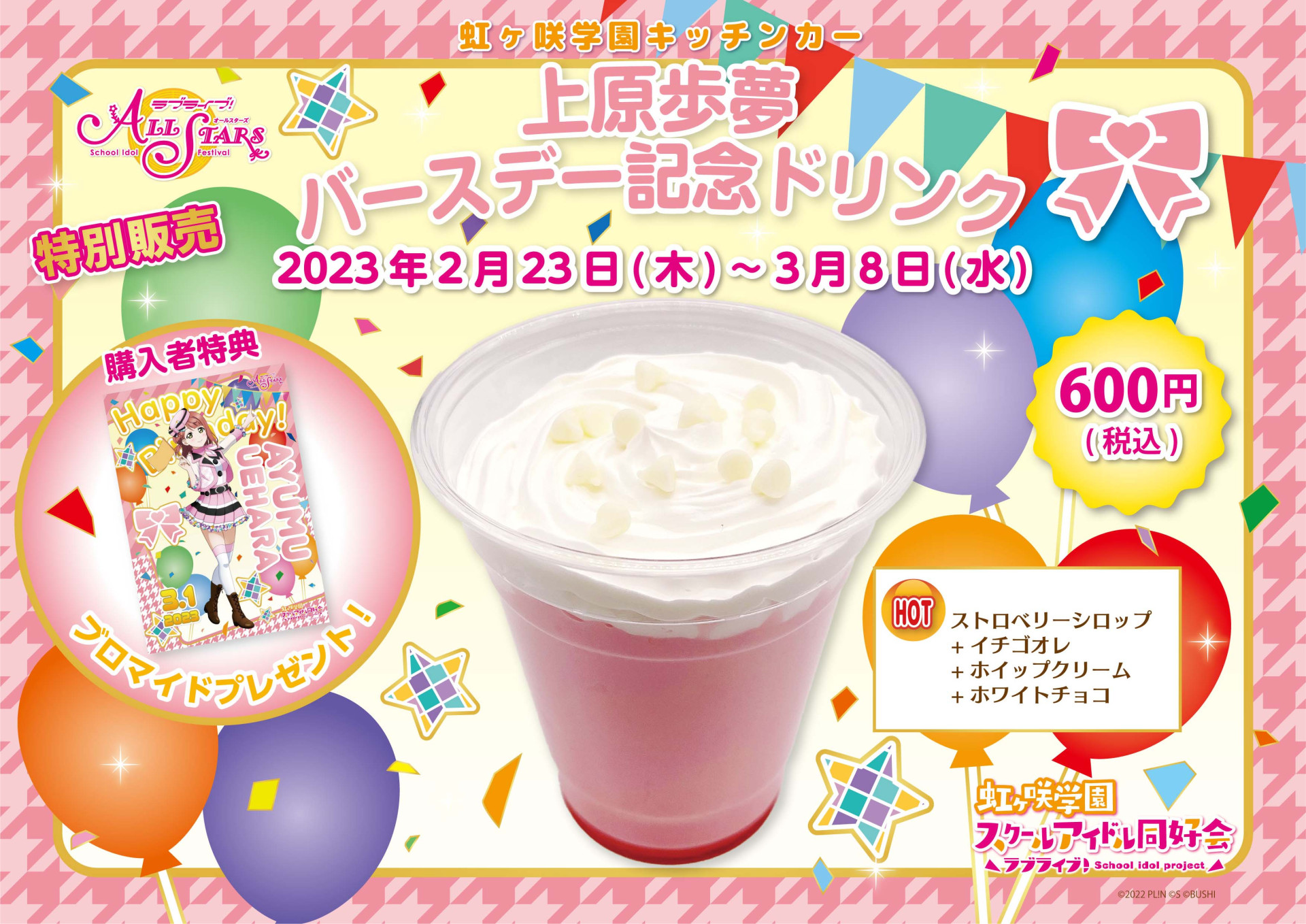 種類 :全13種(高咲 侑、上原 歩夢、中須 かすみ、桜坂 しずく、朝香 果林、宮下 愛、近江 彼方、優木 せつ菜、エマ・ヴェルデ、天王寺 璃奈、三船 栞子、ミア・テイラー、鐘 嵐珠)