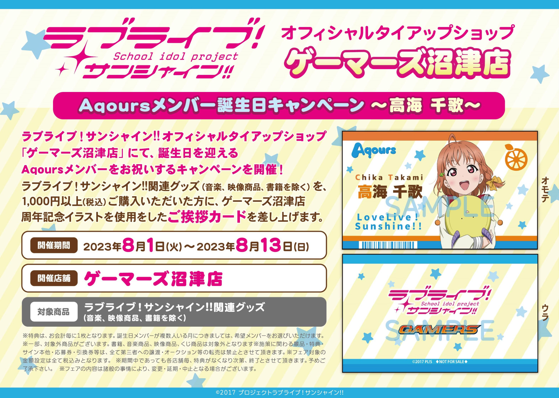 「ラブライブ!サンシャイン!!」オフィシャルタイアップショップゲーマーズ沼津店 Aqoursメンバー誕生日キャンペーン~高海千歌~開催のお知らせ