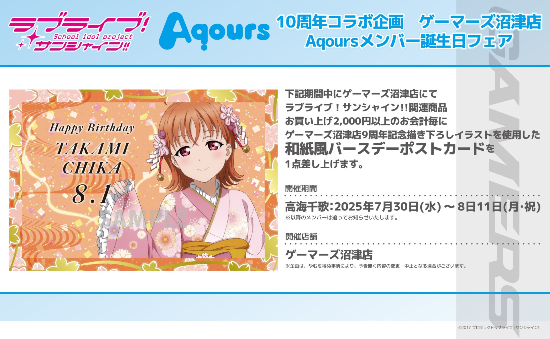 ゲーマーズ沼津店より、「ラブライブ!サンシャイン!!」Aqours10周年コラボ企画 ゲーマーズ沼津店Aqoursメンバー誕生日フェア開催のお知らせ