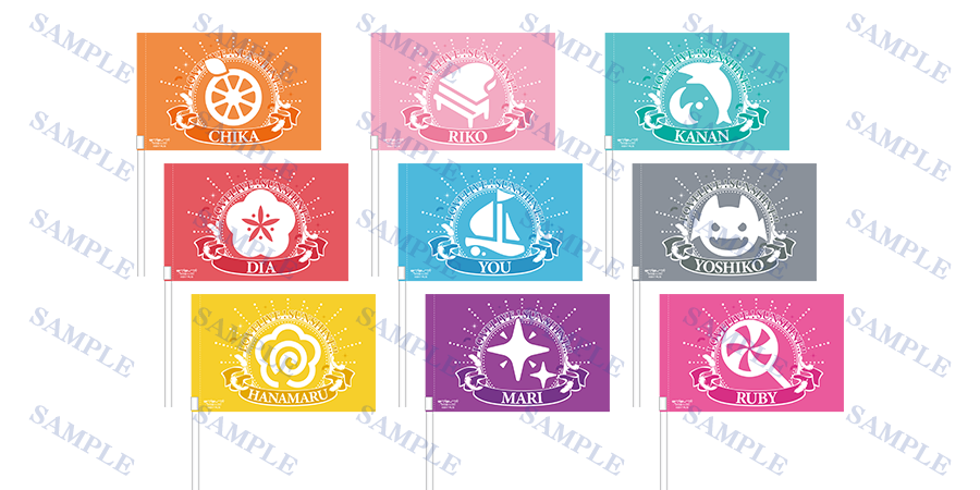高海千歌:みかん色、桜内梨子:サクラピンク、松浦果南:エメラルドグリーン、黒澤ダイヤ:レッド、渡辺曜:ライトブルー、津島善子:ホワイト、国木田花丸:イエロー、小原鞠莉:ヴァイオレット、黒澤ルビィ:ピンク